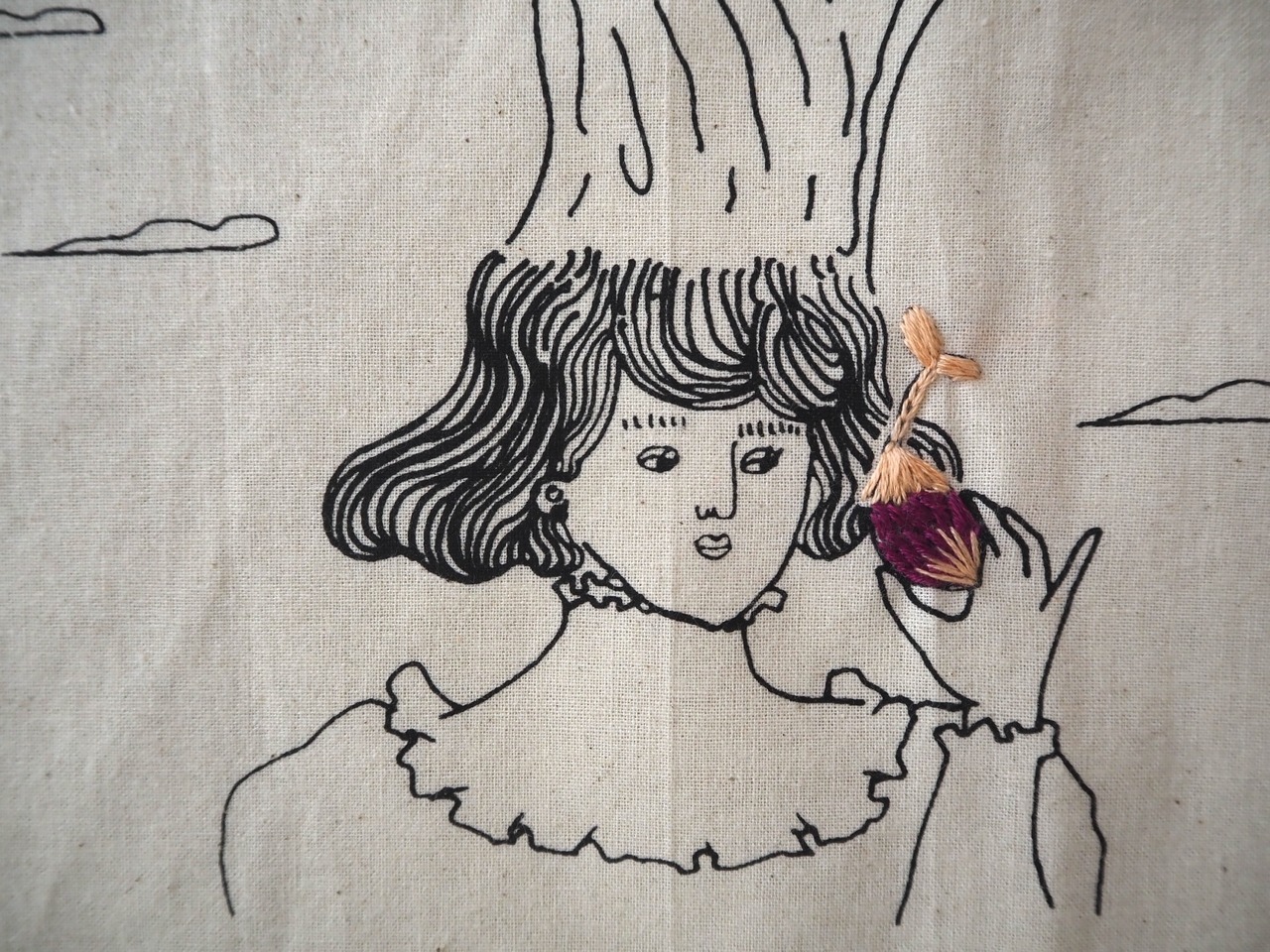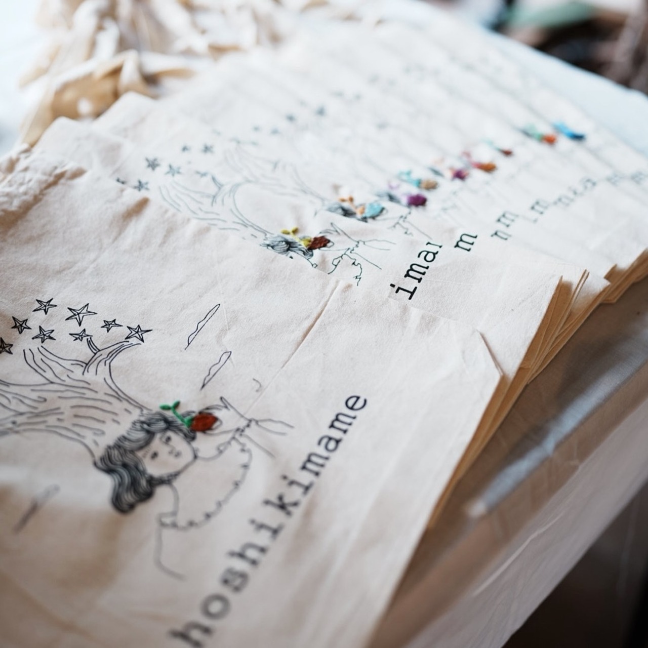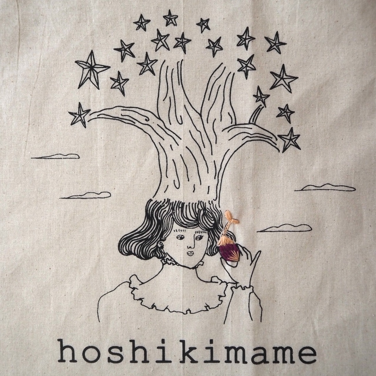 小さな豆が、木になり、星を実らせるように、暮らしの中に育つよろこびと、静かなきらめきをお届けするhoshikimameのコンセプトをイラストにして、小さな豆に刺繍をしています。