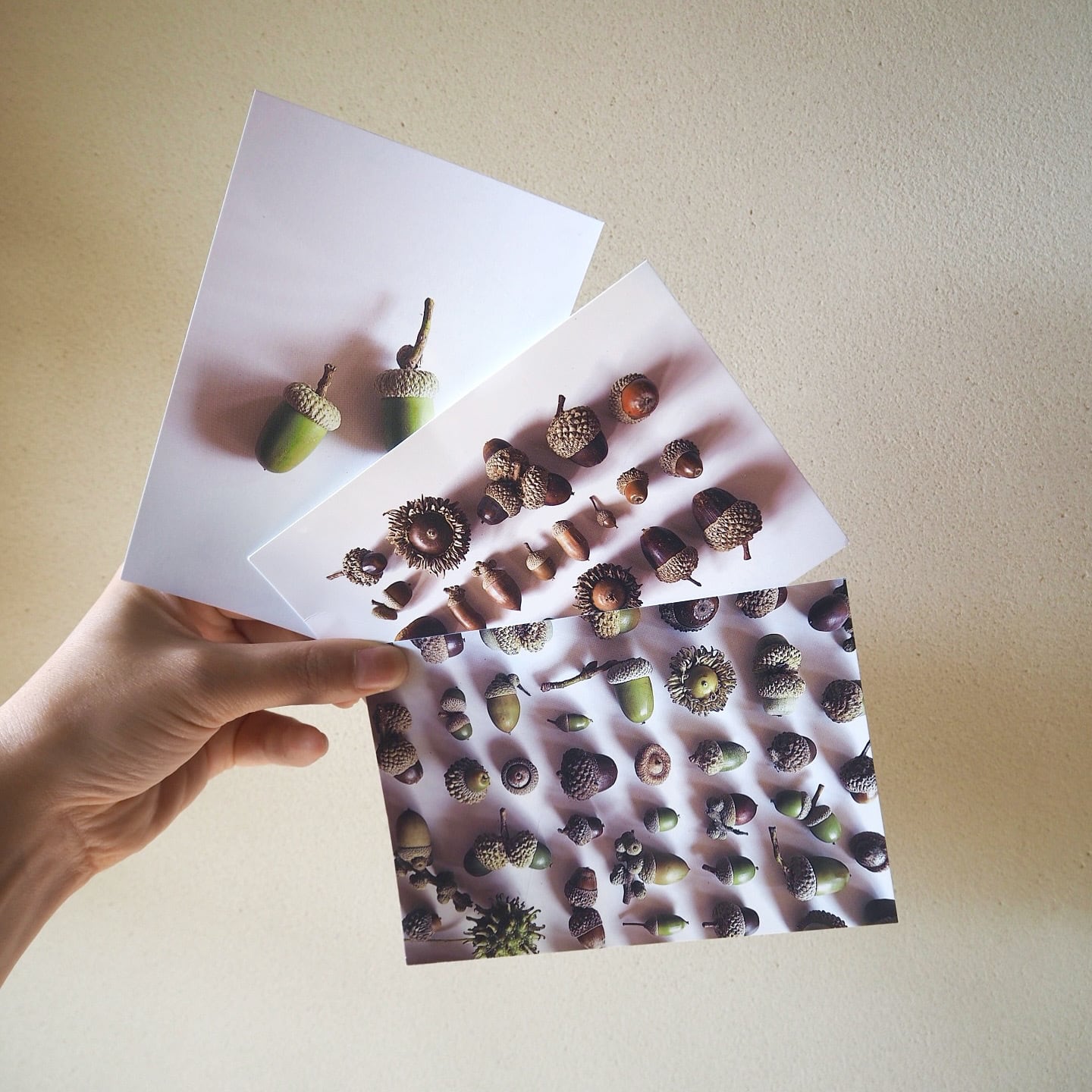 形も大きさも様々などんぐりを標本のように並べた3種類のポストカード。